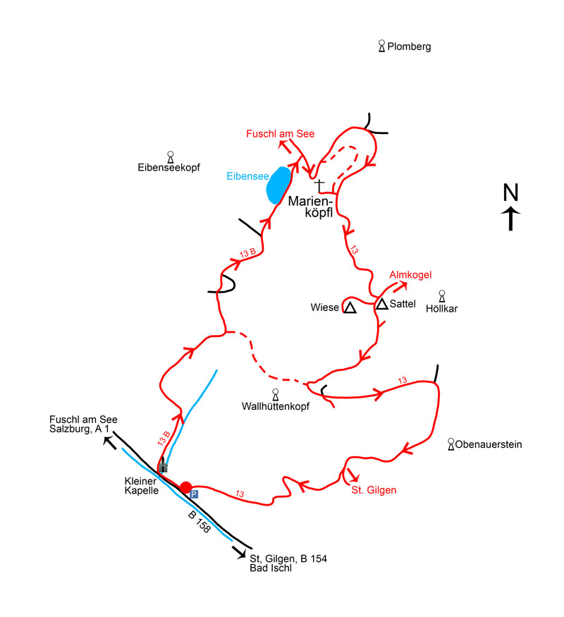 Ein gleich links abzweigender Forstweg wird von uns ignoriert. Nachdem man bei einem Schranken vorbeigekommen ist, erblickt man links von uns Richtung Norden den bewaldeten Höllkar (1.169 m, Abb. 15), nach dem dieser Teil der Salzkammergutberge benannt ist. Rund 15 Minuten von der Abzweigung des Verbindungswegs genießt man bei einer weiteren Abzweigung, die von uns ignoriert wird, vielleicht den schönsten Blick unserer Rundwanderung: Richtung Osten (Abb. 16) sind der Schafberg, der östliche Teil des Mondsees sowie an diesen anschließend der Südteil des Attersees und im Hintergrund Gipfel des Höllengebirges zu sehen. Mit einer Mini-Gegensteigung wendet sich unsere markierte Forststraße langsam rechts Richtung Süden und führt uns nahe zum felsigen Obenauerstein (1.027 m), an dem wir fast eben rechts vorbeiwandern. Wieder Richtung Südwesten absteigend, erfreut man sich im nächsten Teil unserer Wanderung an grandiosen Alpenblicken Richtung Süden (Abb. 17) – unter anderem zum Zwölferhorn (1.522 m). Nach einer markierten Abzweigung, bei der man links nach St. Gilgen absteigen könnte, unterstützen Serpentinen unseren weiteren Abstieg. Rund 1,0–1¼ Stunden vom höchsten Punkt unserer Tour erreichen wir beim Parkplatz knapp unterhalb der „Kleiner Kapelle“ wieder unseren Ausgangspunkt bei der Bundesstraße B 158 (Abb. 18).