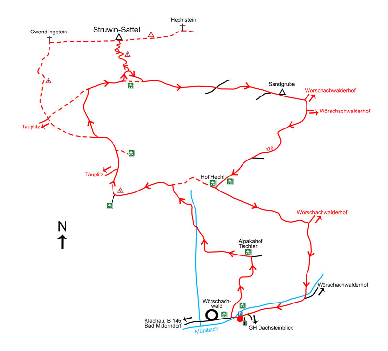Ausgangspunkt unserer Rundtour ist die kleine Kirche (1.017 m, Abb. 2) von Wörschachwald, die sich in einem engen Talkessel befindet. Wenige Meter vor der Kirche und einer Brücke über den Mühlbach zweigt – talauswärts gesehen – rechts Richtung Norden (Abb. 3) eine beschilderte, asphaltierte und steil aufwärtsführende Zufahrtsstraße ab, von der man Richtung Südwesten erstmals den Grimming sieht. Bald schon geht die Straße in einen Waldweg über, der uns weniger steil zuerst mit einem Rechts- und gleich anschließend mit einem Linksbogen in etwas über 10 Minuten zum Alpakahof Tischler (ca. 1.065 m, Abb. 4) führt. Hier biegen wir links auf einen breiten Weg ab und wandern mit Blick hinauf zu unserem Wanderziel und zu einer Alpaka-Herde (Abb. 5), die hier gezüchtet wird, Richtung Westen. Wir setzen unsere Wanderung anschließend auf einem Wiesenweg und dann auf einem im Sommer etwas verwachsenen Steig fort, der sich nach wenigen Minuten bergwärts Richtung Norden wendet und – nach einer Bachquerung steiler werdend – den Berghang aufwärtsführt. Beim ersten Sichtkontakt zum Hof Hechl (1.161 m, Abb. 6) halbrechts von uns wendet sich unser Steig nach links, wir passieren ein Törl und wandern mäßig steil im Wald aufwärts, bis wir etwa 20 Minuten vom Alpakahof Tischler in eine querende Forststraße links einbiegen. Rechts könnte man zum Hof Hechl gehen. Auf der Forststraße geht es nun im leichten Auf und Ab ca. 10 Minuten mit weiterem Blick zum Grimming links von uns Richtung Westen (Abb. 7), bis wir eine Alm erreichen. Vor uns wird erstmals der Dachstein (2.995 m) mit dem Hallstädter Gletscher sichtbar.