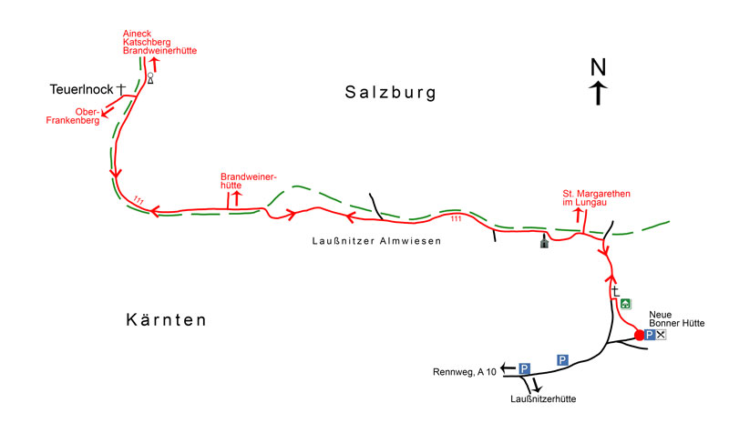 Der Ausgangspunkt unserer relativ kurzen Wanderung ist die im Nockberggebiet gelegene Neue Bonner-Hütte (1.713 m, Abb. 2) südöstlich unseres Gipfelziels. Zuerst fährt man über eine zwar schmale, aber asphaltierte Bergstraße vom am südlichen Ende des Katschbergtunnels (Tauernautobahn A 10) gelegenen Ort Rennweg am Katschberg (Abb. 3) hinauf in den Weiler Oberfrankenberg und von diesem über eine teilweise recht ruppige Forststraße zu unserem Ausgangspunkt. Bereits vom Gästeparkplatz direkt vor der Hütte hat man einen schönen Blick zu den Grashängen des Teuerlnocks (Abb. 4). Wer weder vor noch nach der Wanderung einkehren möchte, kann seinen PKW etwa 450 m vor der Hütte am Straßenrand abstellen und von dort die Tour starten.